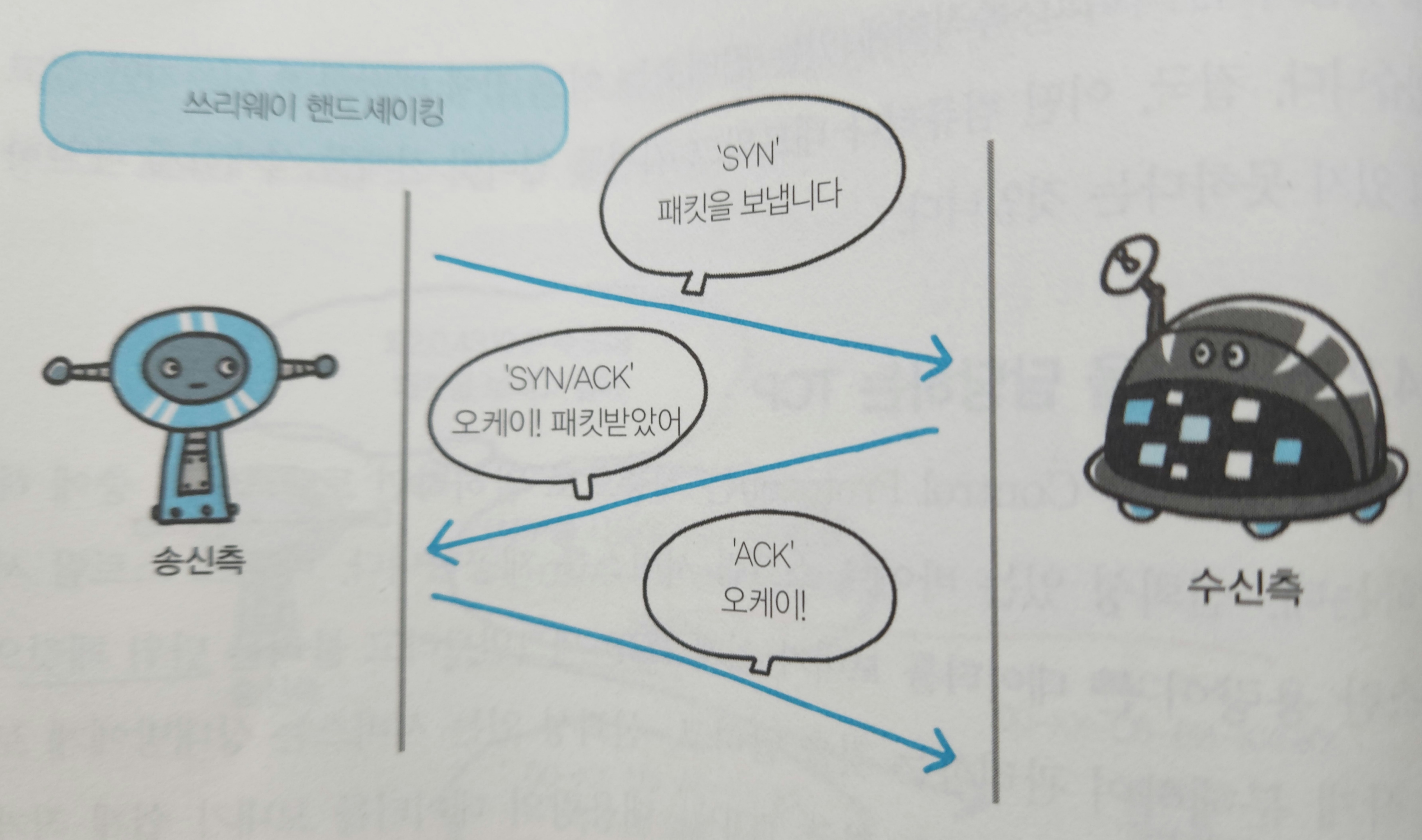 상대방에게 데이터를 확실하게 보내기 위해 TCP는 3 way handshaking이란 방법을 사용하고 있습니다. 이 방법은 패킷을 보내고 바로 끝내는 것이 아니라, 잘 보내졌는지 여부를 SYN과 ACK라는 TCP 플래그를 이용해 상대방에게 확인합니다.