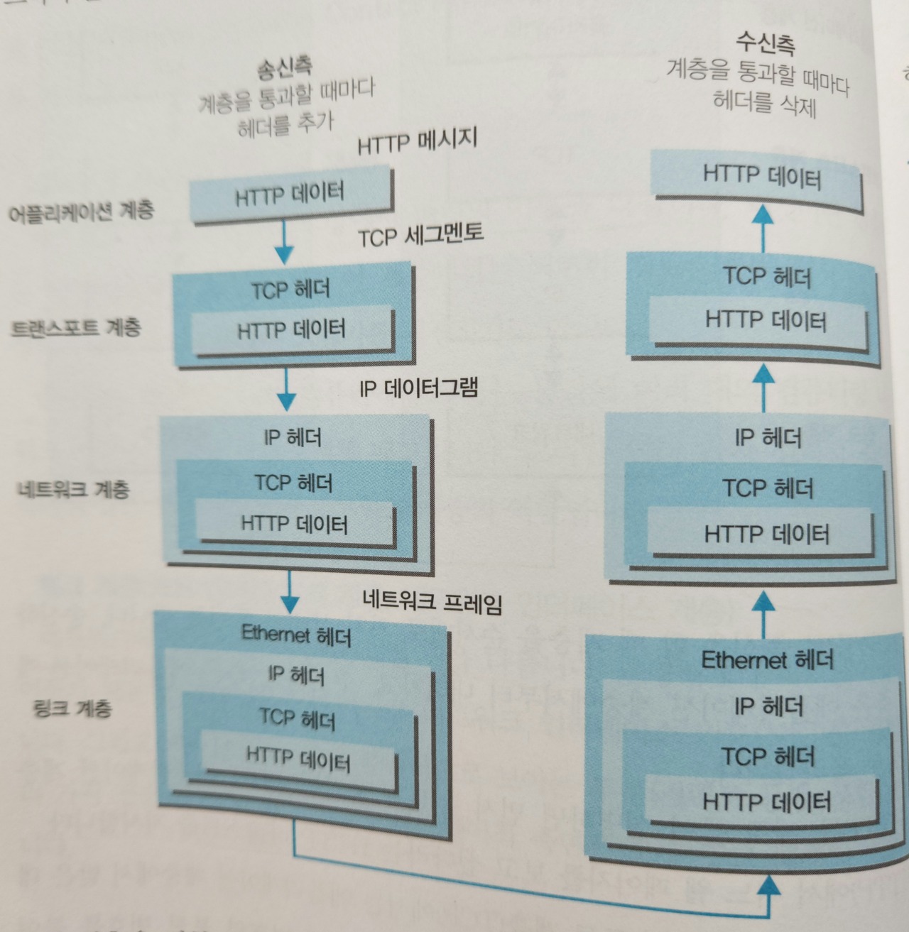 각 계층을 거칠 때는 반드시 헤더로 불려지는 해당 계층마다 해당 계층에 필요한 정보를 추가합니다. 반대로 수신측에서는 각 계층을 거칠 때마다 반드시 해당 계층마다 사용한 헤더를 삭제합니다.