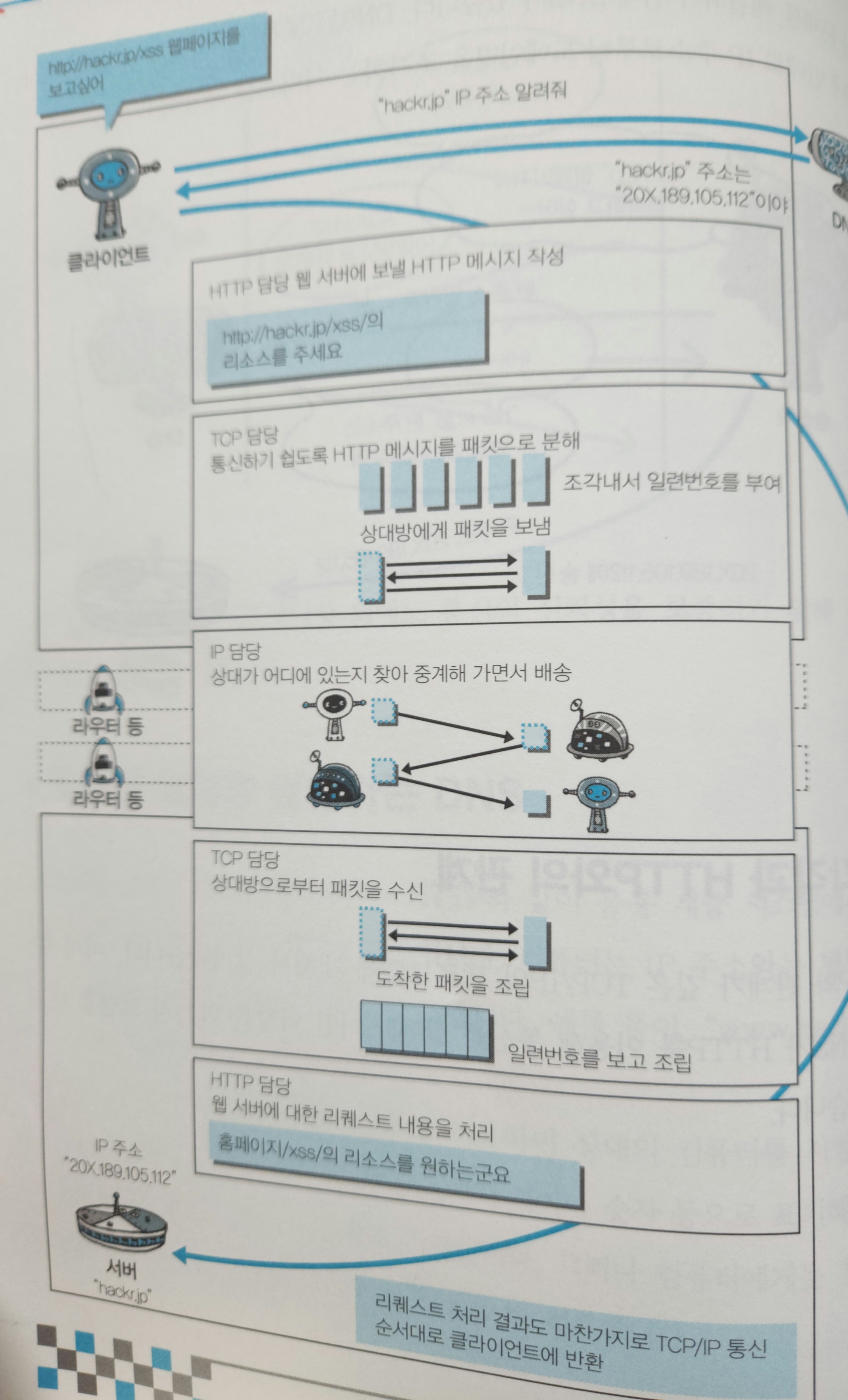 위 그림을 보고 HTTP 통신에서 IP, TCP, DNS가 어떤 역할을 하는지 알 수 있습니다.