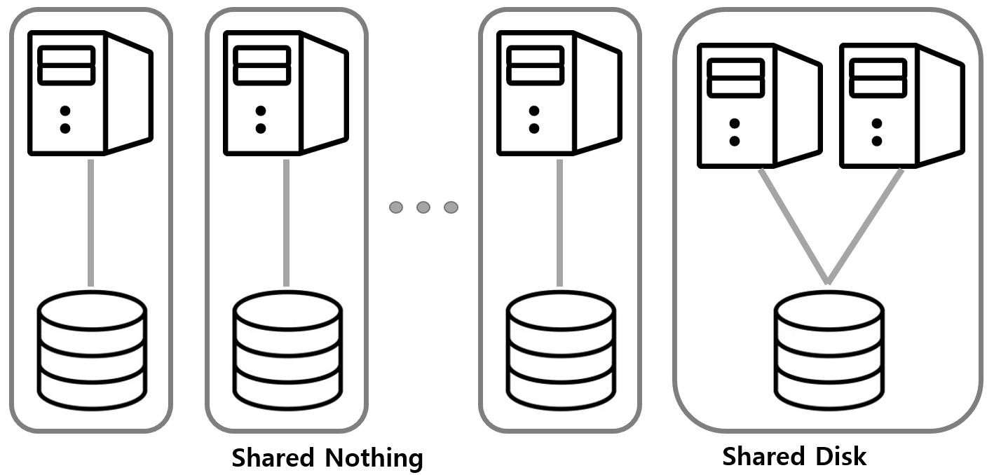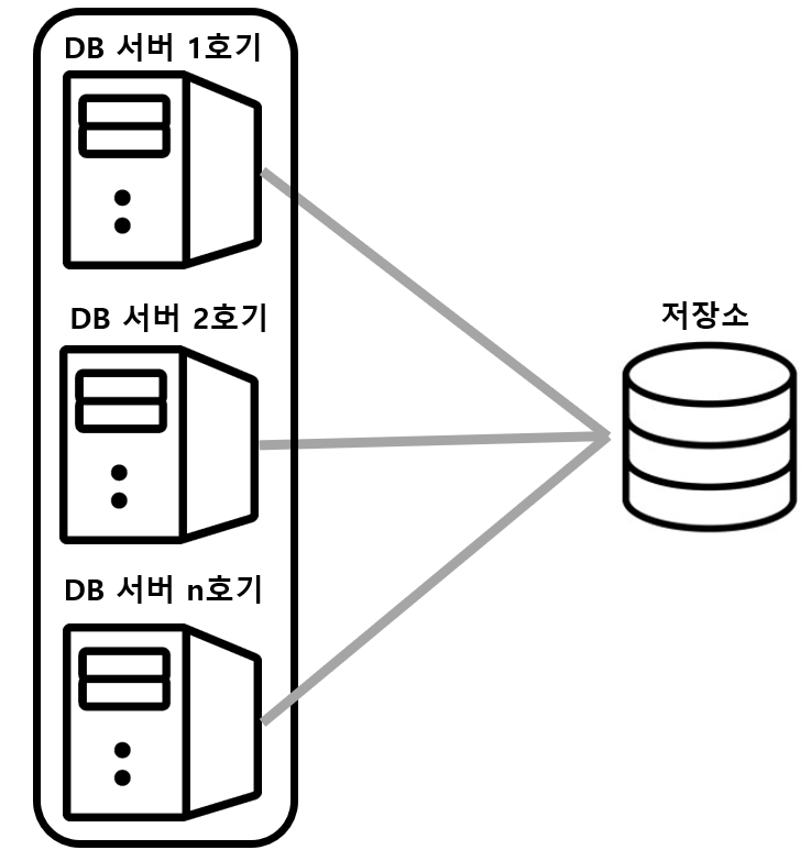 - 복수의 DB 서버의 자원(CPU, Memory)을 사용하여 성능을 향상시키지만, 저장소가 병목이 되기 때문에 생각한 만큼 성능 향상이 되지 않는 경우도 있음
